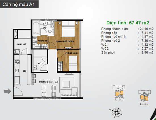 Diện tích căn hộ: từ 1 phòng ngủ đến 3 phòng ngủ
